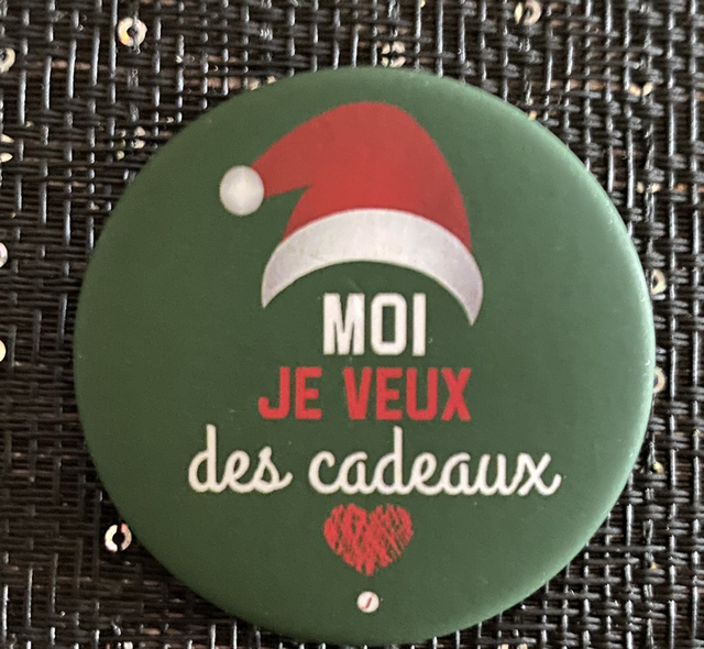 Badge 45mm Noël « Moi j’veux des cadeaux » vert